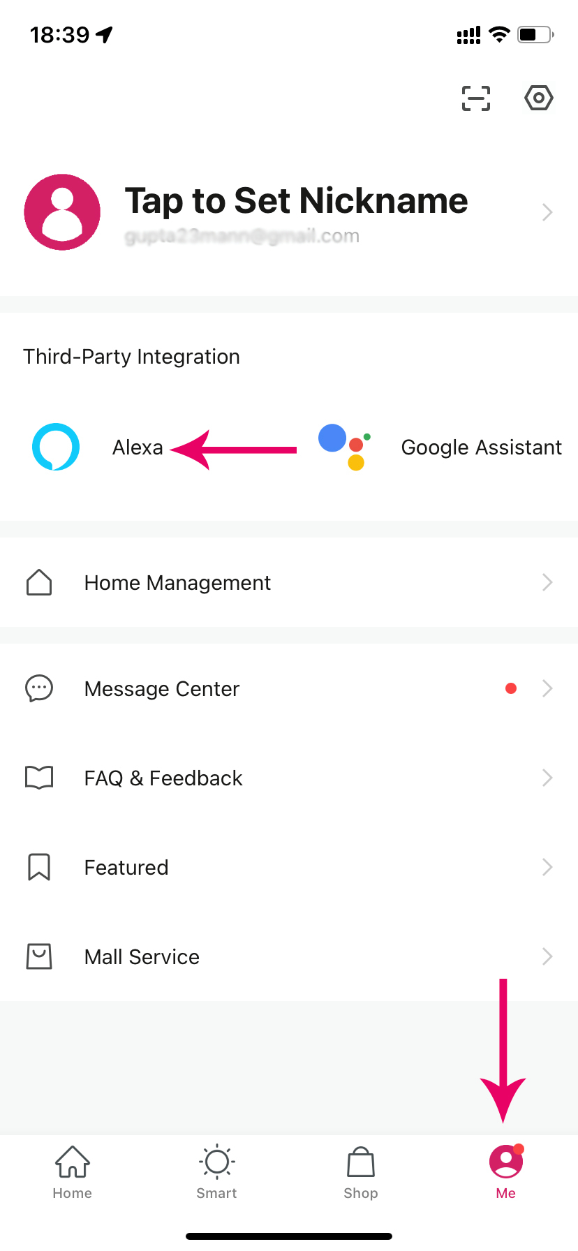 - Open Homemate Smart App, go to your profile or click on "Me", under Third